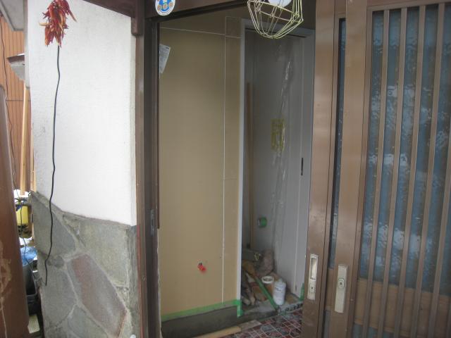 玄関入ってすぐの場所で店内とブルーシートで仕切っていて