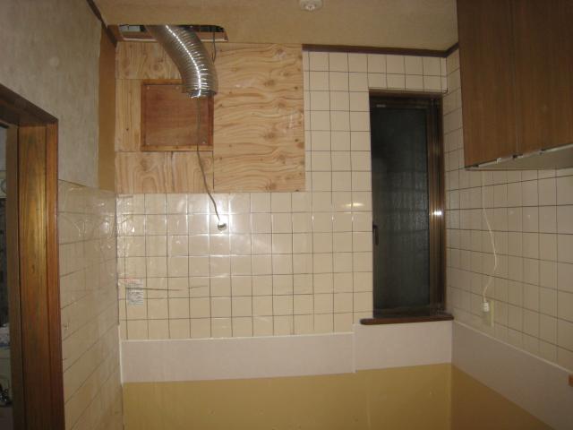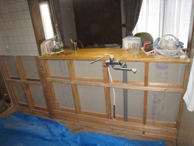 一部タイルとボードを撤去してボードを張りなおしキッチンパネルを回しレンジフードも間口90cm