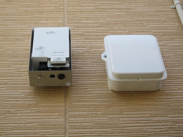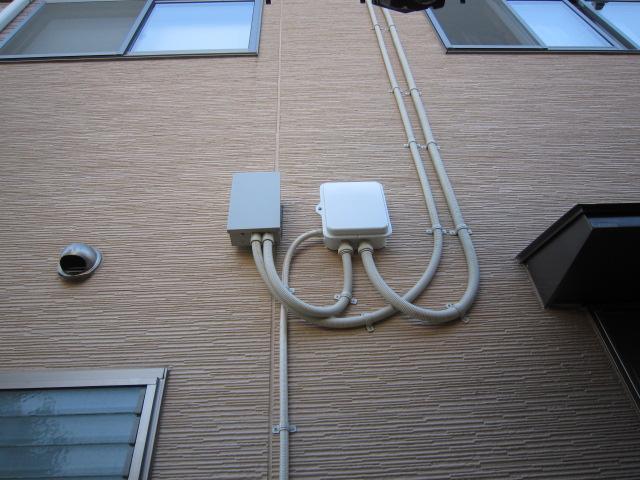 壁貫通した穴は、接続箱に、、、左は昇圧器ユニットです。