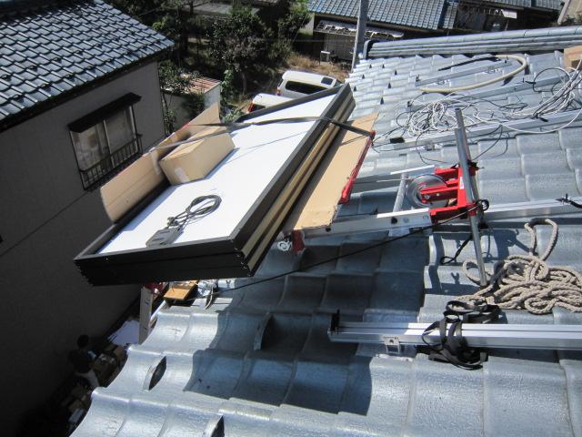 パネルの搬入は母屋の3階から中央の玄関屋根へ出て