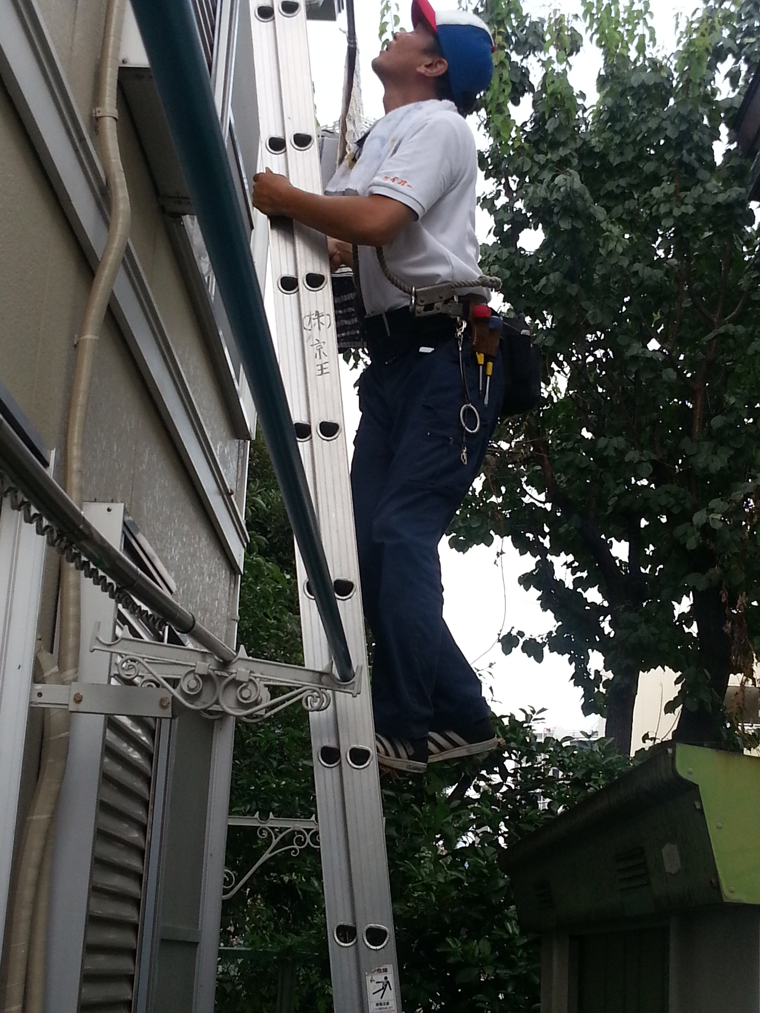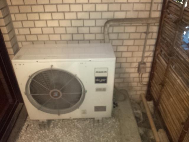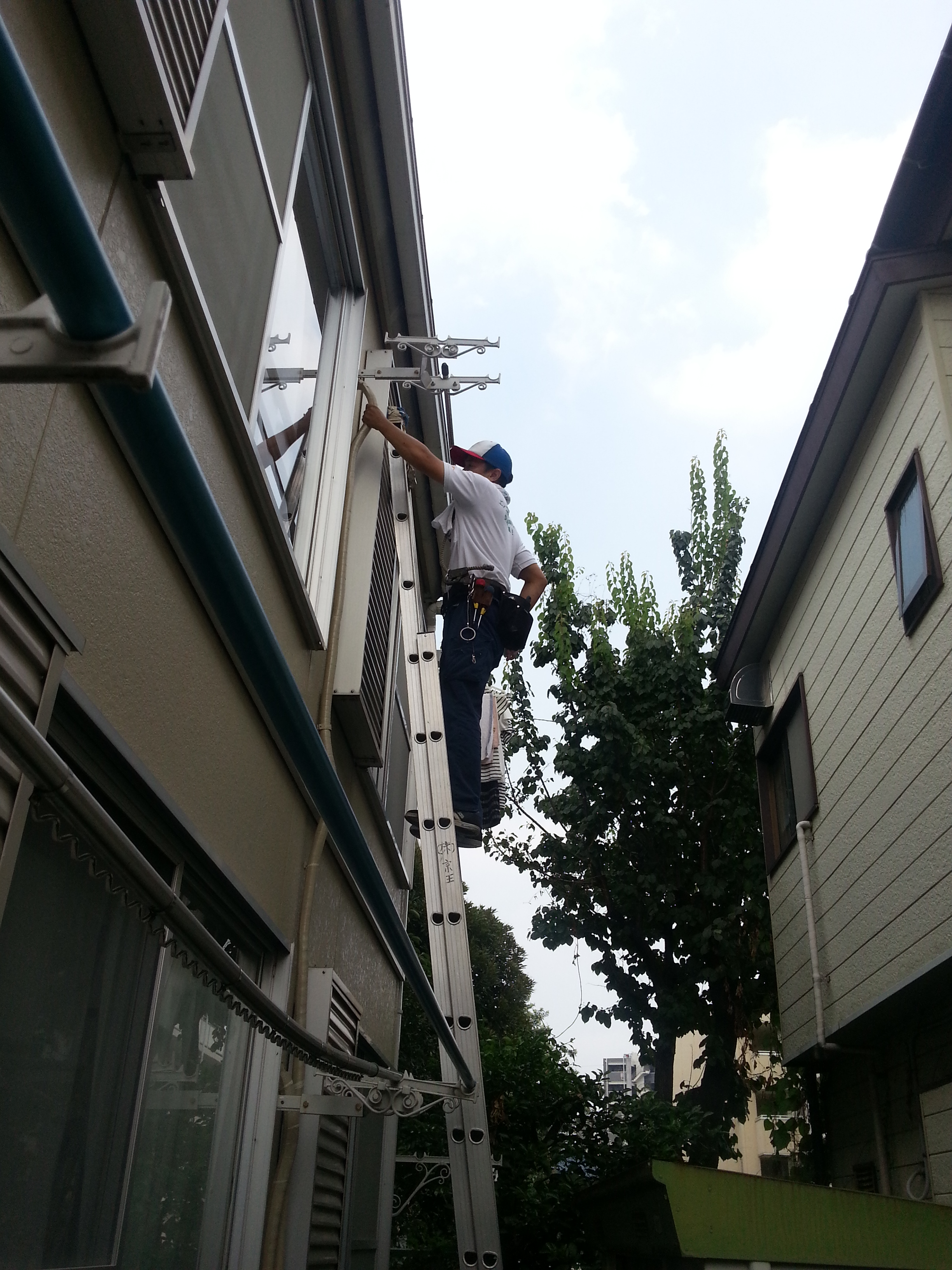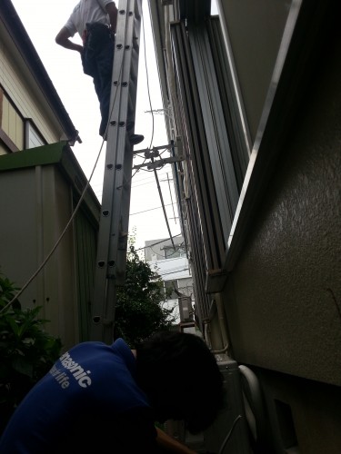 渋谷区笹塚にてエアコンの工事です。アクロバティックな作業しました。