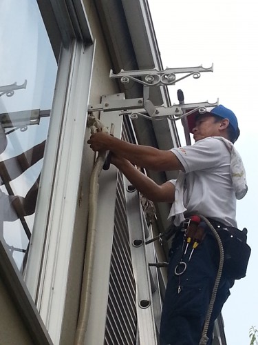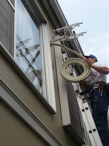 室内機を設置終えたので二人で外に出て、室外機との接続作業をしています。
