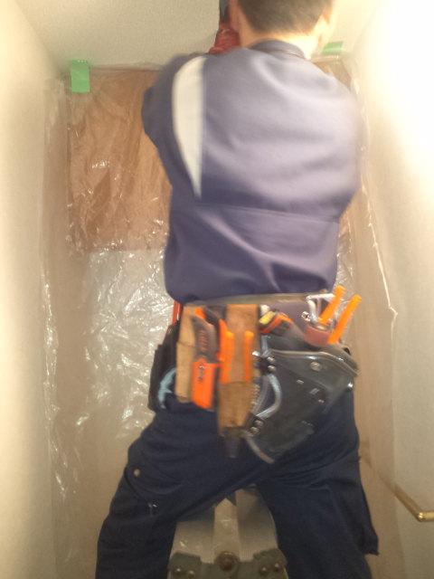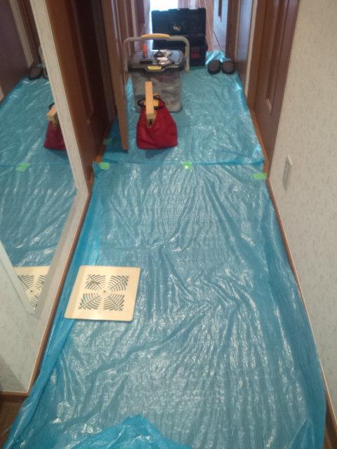 天井の石膏ボードを加工するので玄関、廊下とトイレの中を養生して作業します。