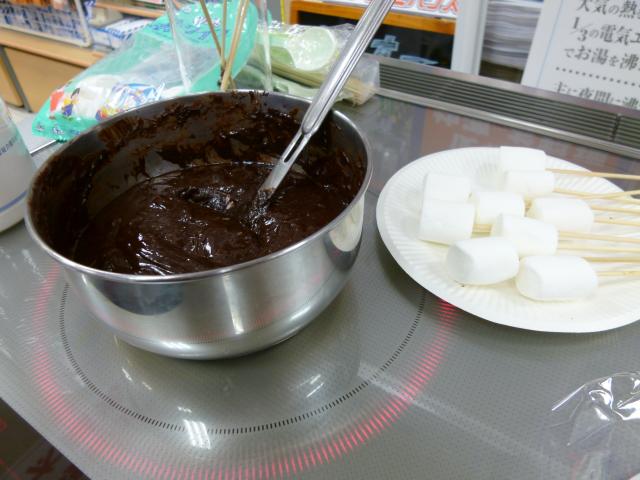 IHクッキングヒーターの前では、チョコをとろ火で溶かしてマシュマロをくぐらせるチョコレートフォンデュをご用意しました。