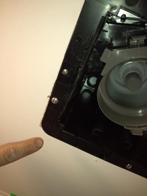 ネジを取り付けるための換気扇のフチが天井板で隠されています。