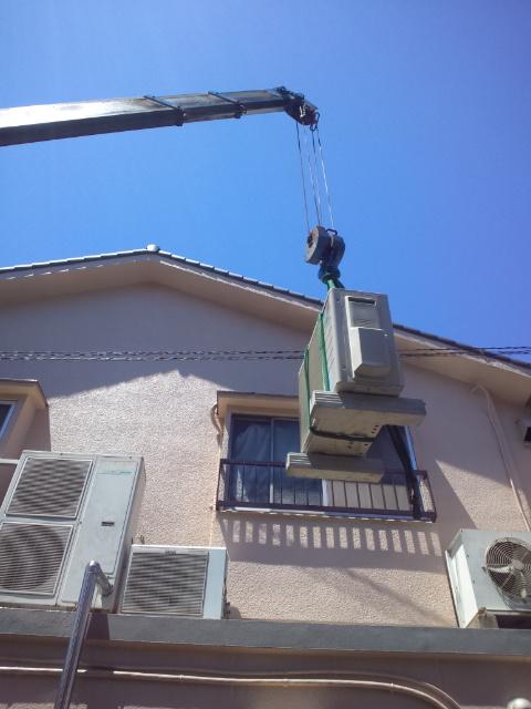 室外機は人間では上げ下ろしが出来ないのでユニック(クレーン)で行います。