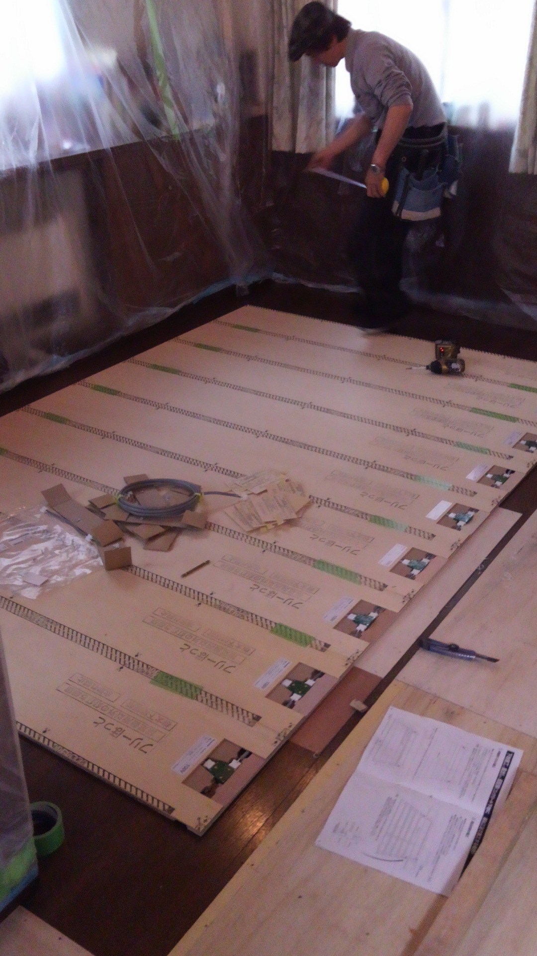 床暖房の電源用のケーブルを配電盤から壁のなかを通して床下にまわす工事をしました。