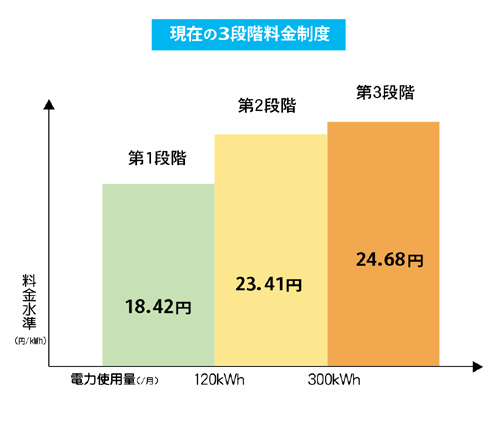 120kWhまでの第1段階料金は比較的低い料金、120kWhを超えて300kWhまでの第2段階料金は平均的な料金、300kWhを超えた第3段階料金やや割高な料金、というように区分され、電力使用量が増えるにつれて1kWhあたりの単価が上がっていく仕組みです。