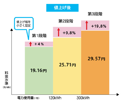 これに対し、電気利用量が増えるに従って適用される第2段階・第3段階の料金の値上げ幅が大きく設定されています。