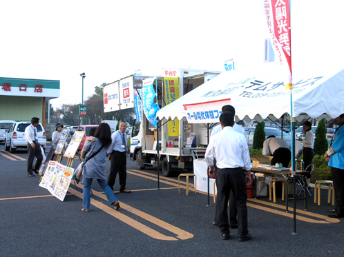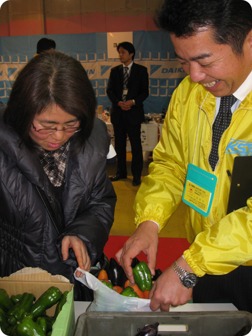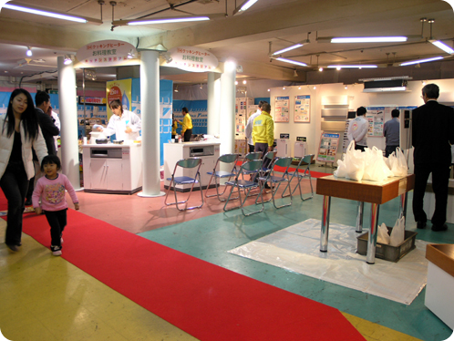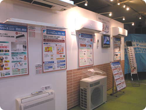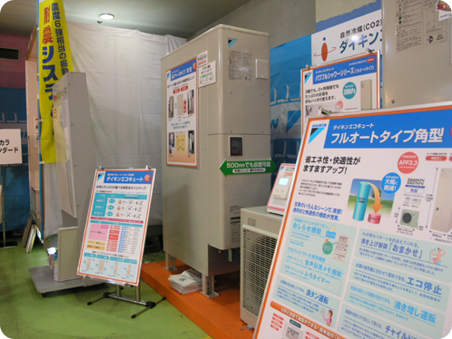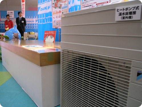 後ろには、震災以降改めて注目を集めている蓄熱暖房機についてお客様に説明している株式会社白山製作所の営業の方が見えますね。
