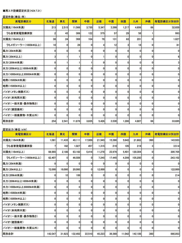 また、今年7月から実施された再生可能エネルギーの固定価格買取制度についても、7月末時点での「設備認定」の状況が経済産業省より発表されました。