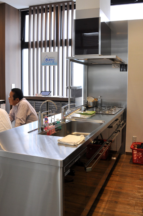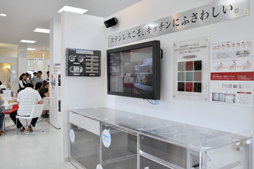 ショールームに入ってまず一際目を引くのは、ステンレス製のシステムキッチンの展示。