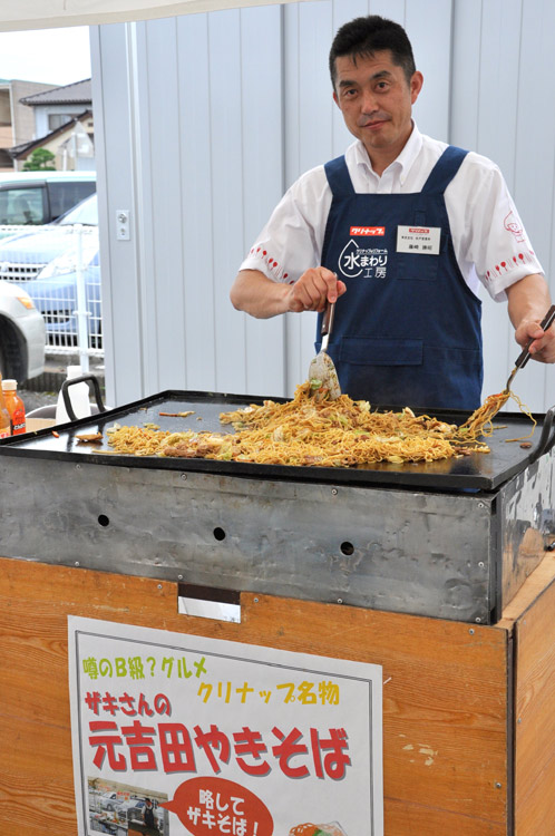 この日はフェアということで駐車場に設営されたテント内では、クリナップ名物「ザキさんの元吉田焼きそば(略してザキソバ)」なる美味しそうなものが無料で振る舞われていましたヨ!