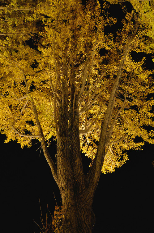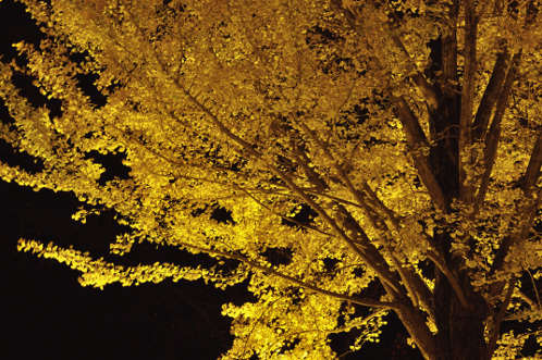 黄色いフィルムを通したLEDライトによって下から照らされ、幻想的に浮かび上がる公孫樹の黄葉、こりゃキレイ。