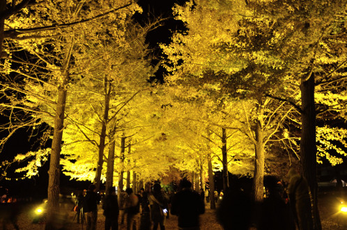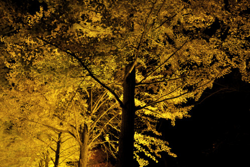 ライトの色自体が黄色いのは意外でしたが、夜の闇の中では白色のライトを使うよりもイチョウ本来の黄葉を鮮やかに魅せてくれるんですね。