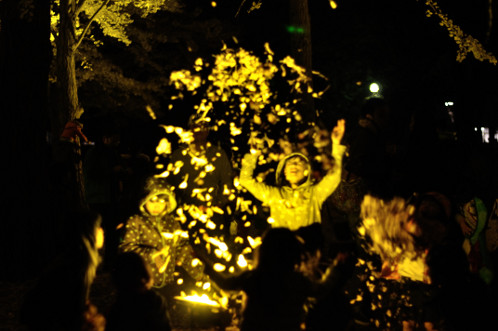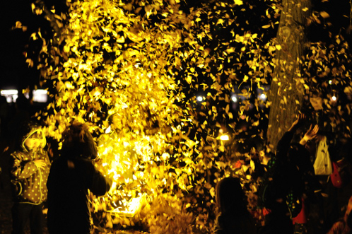 舞い落ちるイチョウの枯葉が、下から照らされキラキラと金色に光り輝き、その度に歓声が上がります。