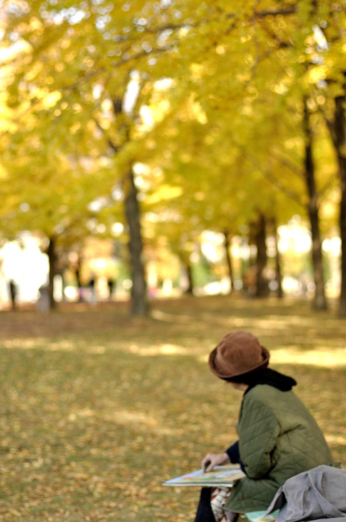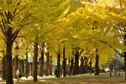 銀杏並木の下の黄色い世界を歩いていると、銀杏の葉を通って降り注ぐ陽の光が急に強まり、辺りが黄金に輝くような瞬間があります。