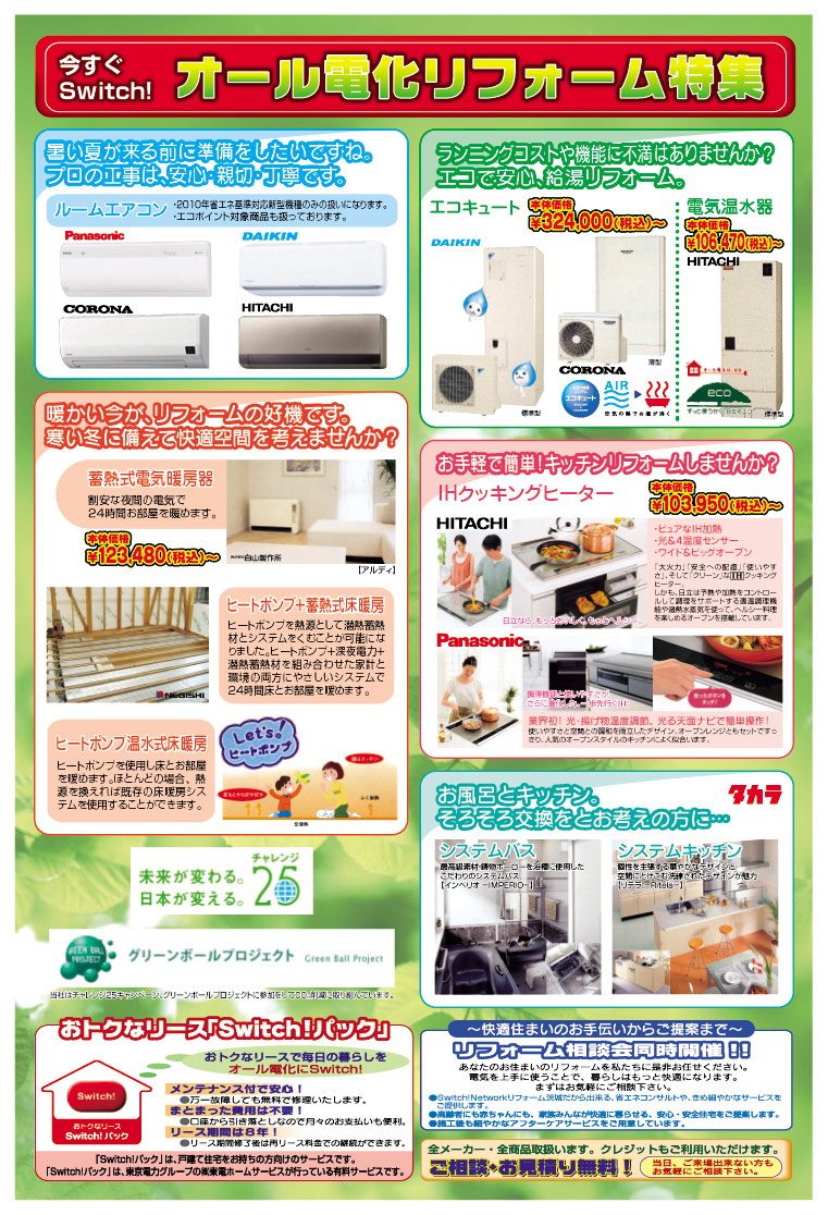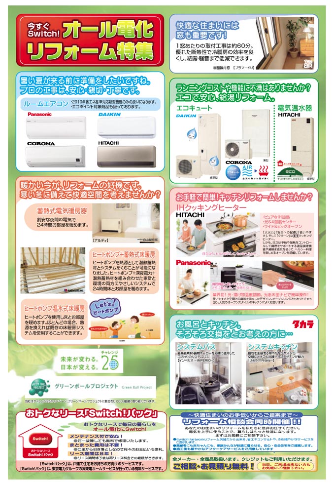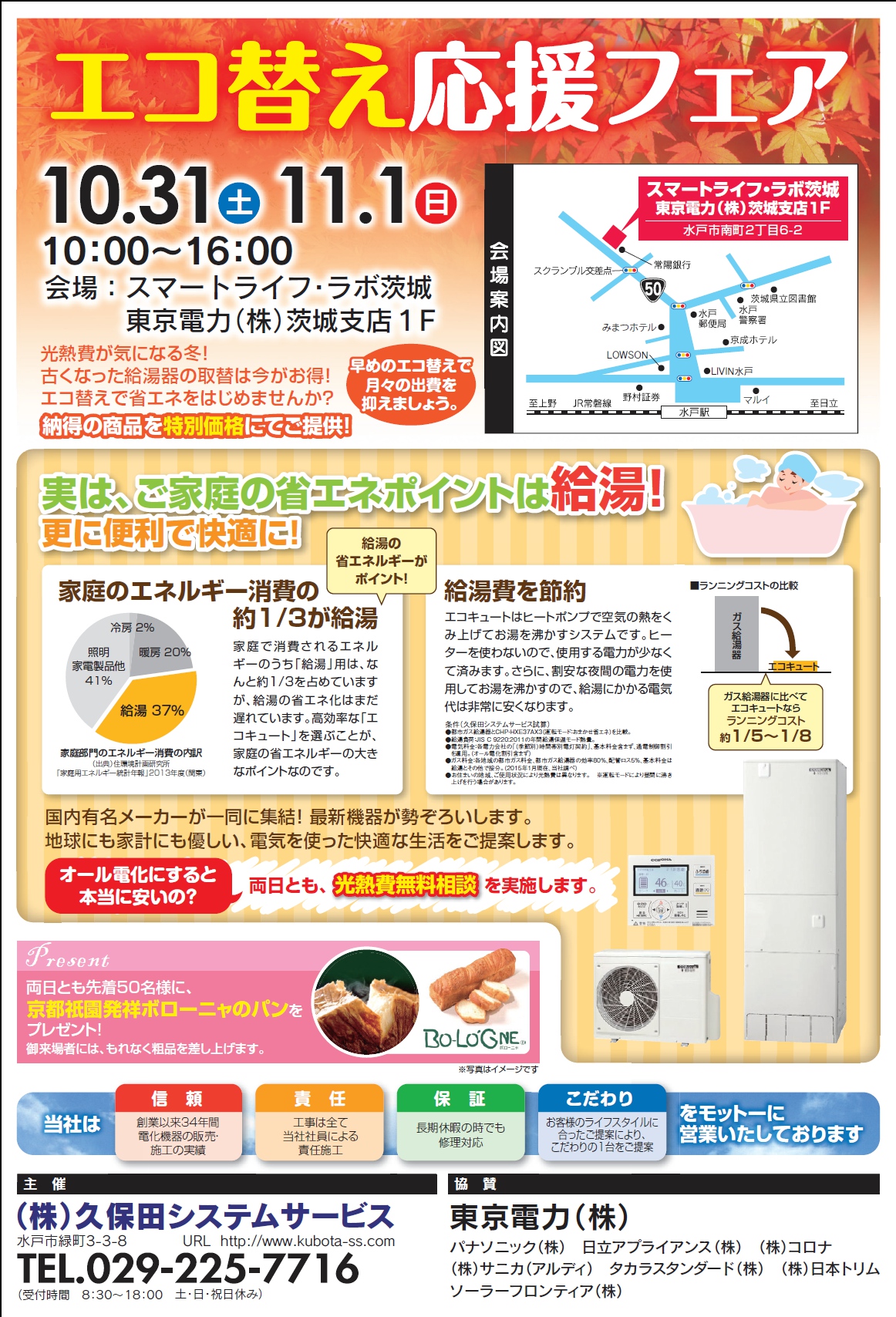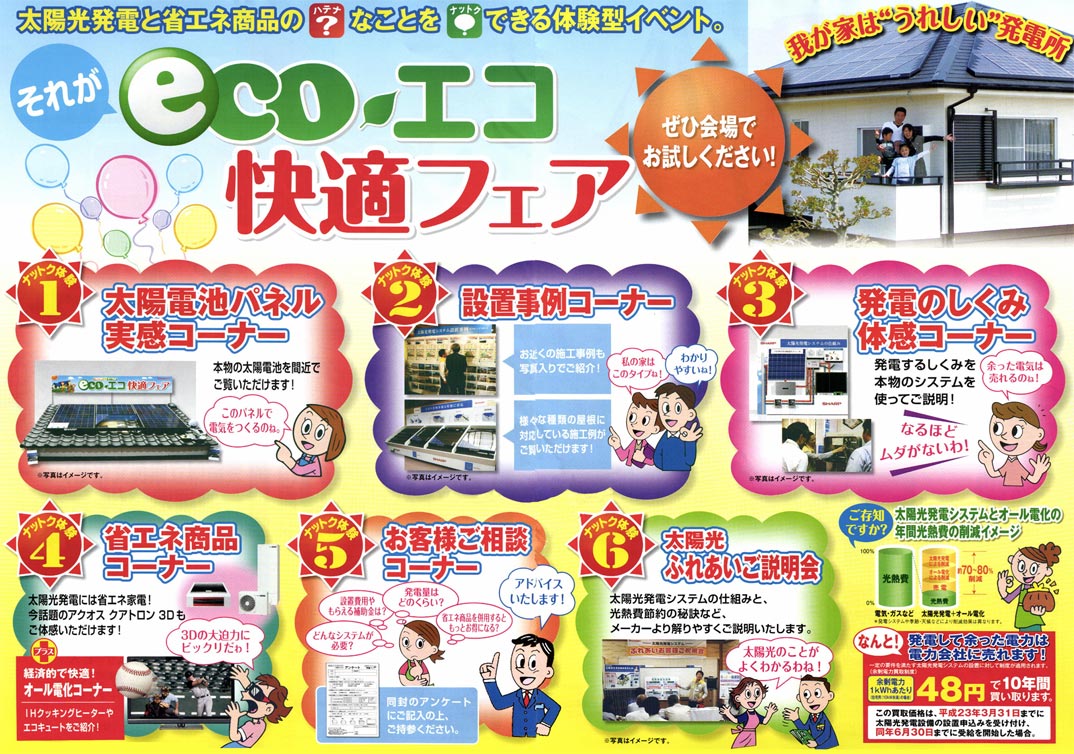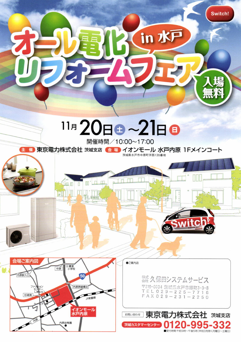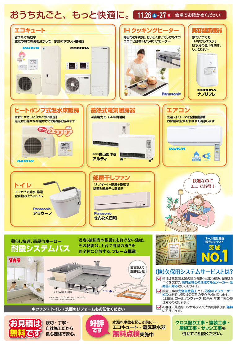 開場ではエコキュート・電気温水器・エコワン等の給湯機器からIHクッキングヒーターや床暖房、システムキッチン・バス、太陽光発電・蓄電池など多数展示いたします。