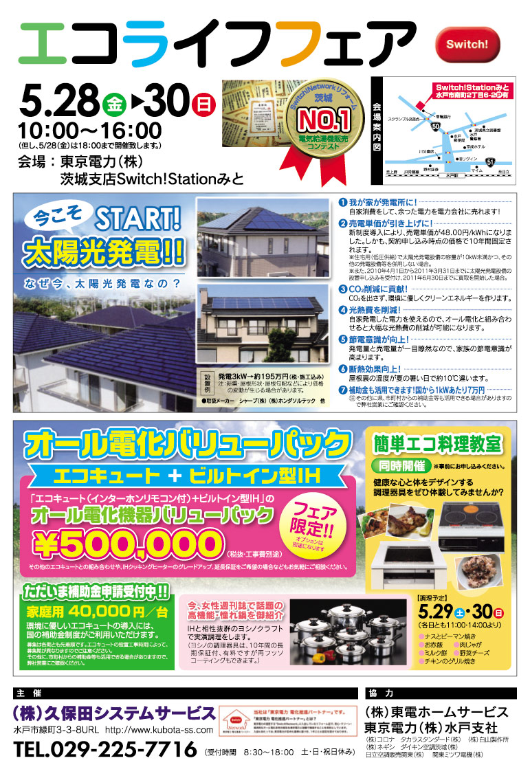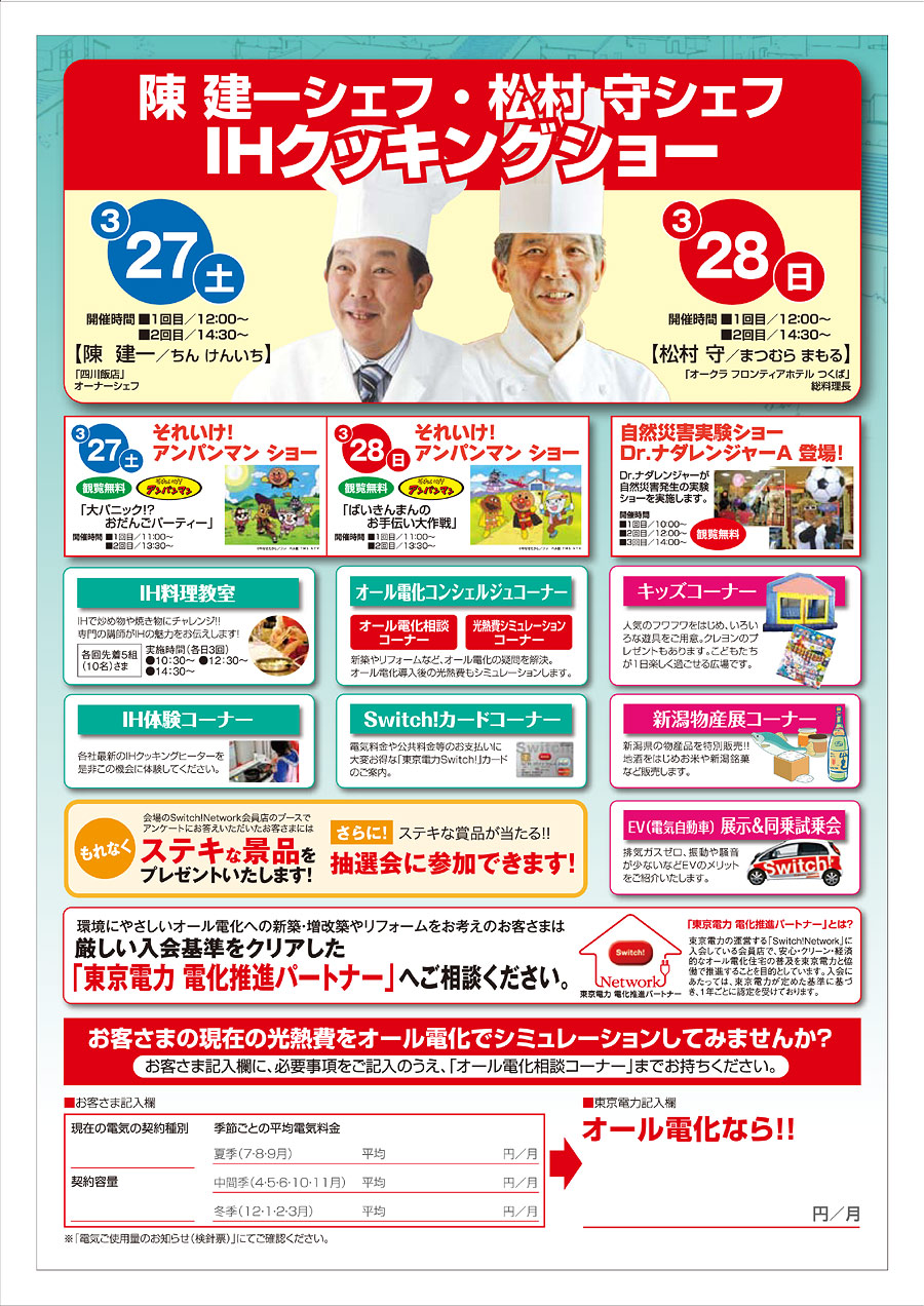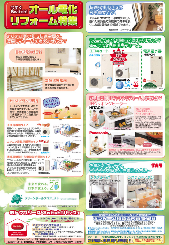 今回もオール電化機器メーカー各社の専門の説明員にご協力いただきますので、新築やリフォームでオール電化を考えている、お風呂やキッチンのリフォームを考えているお客様は、ぜひ一度足をお運びください!