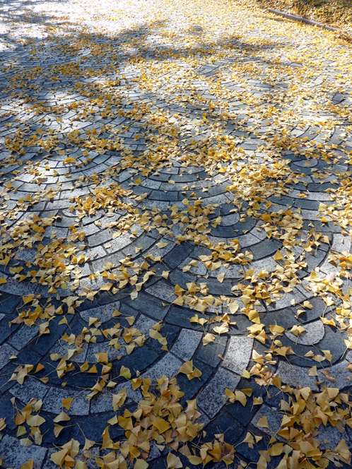 ふと下を見ると、石畳の模様までイチョウの葉っぱをかたちどっている。