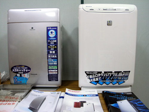 先日当ブログでもご紹介しましたシャープのプラズマクラスター空気清浄機の他に、水に包まれた微粒子イオンで菌やウイルスの活動を抑制するナノイー技術搭載のパナソニックの加湿空気製容器や、強力な酸化分解力を持つ高速電子を発生させてアレル物質までもを除去する光速ストリーマ技術搭載のうるおい光クリエールも展示されました。