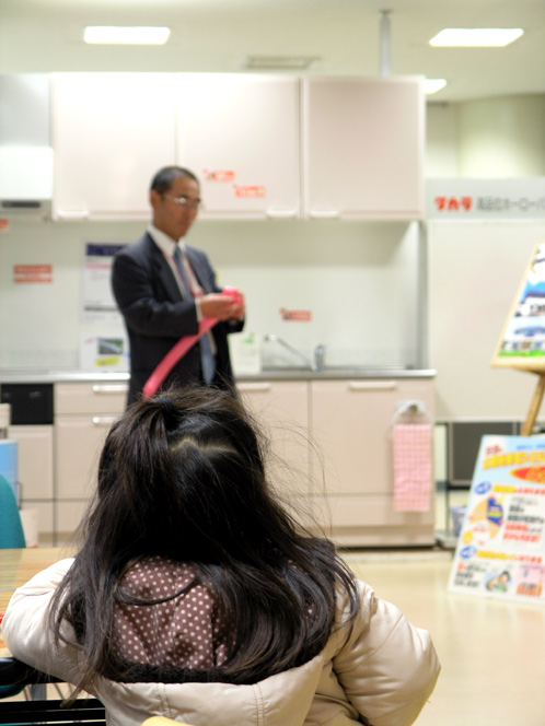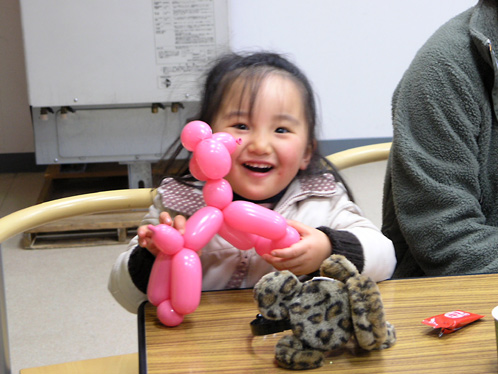 お子様の向こうで東京電力の方が何やらピンクの風船をこねくり回していますよ。