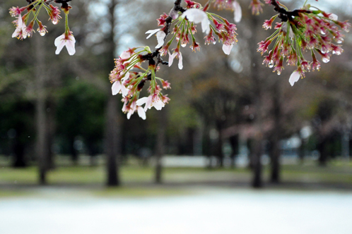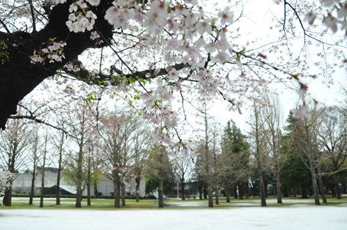 見ごろを終えた桜の花と芽吹き始めた新緑、そして地面には桜の花びらと色づいてきた芝生と雪、というおかしな光景が広がっていました。