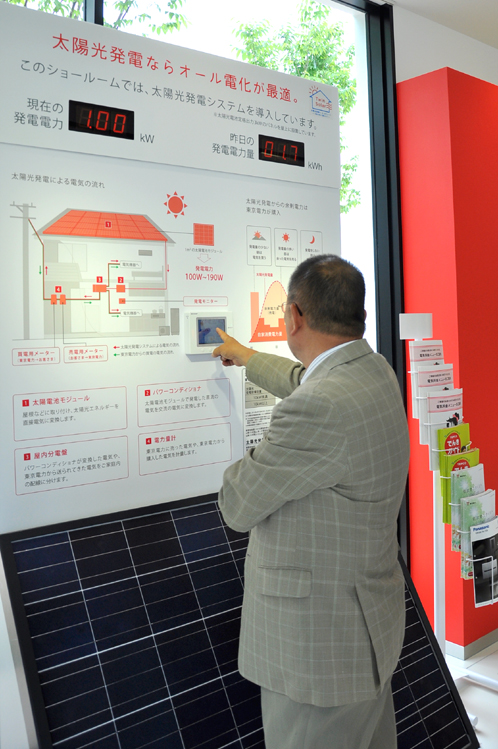 このショールームには実際に太陽光発電システムが設置されており、その発電量はリアルタイムで展示パネルに表示されていました。