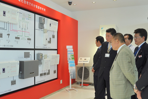 オール電化住宅での分電参考例のパネルを前に説明を受けます。