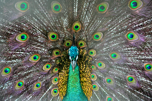 紫陽花のどことなく妖しげな魅力に呼応するかのように妖艶な羽を広げるクジャクくん。