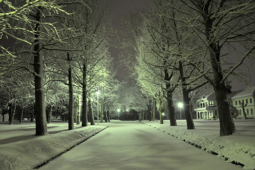 秋には黄金色に色づいた公孫樹(イチョウ)も雪化粧と照明によって幻想的な佇まい。