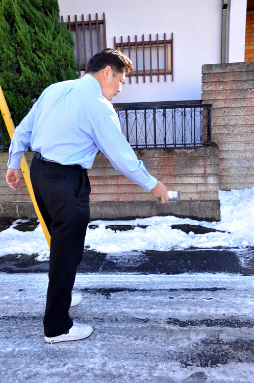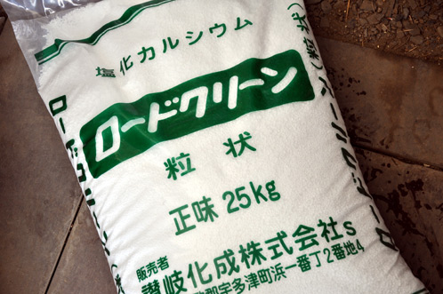 これでは行き交う人々や訪れる企業の皆さまがつるつる滑ってしまう!…というわけで、社長自ら買ってきた塩化カルシウムを道路に撒きました。