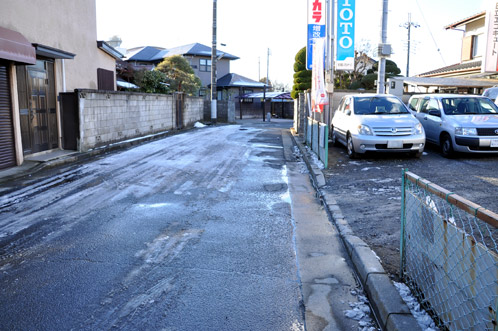 当社事務所の前の道路の一部も日当たりが悪いためガチガチに凍結しておりました。