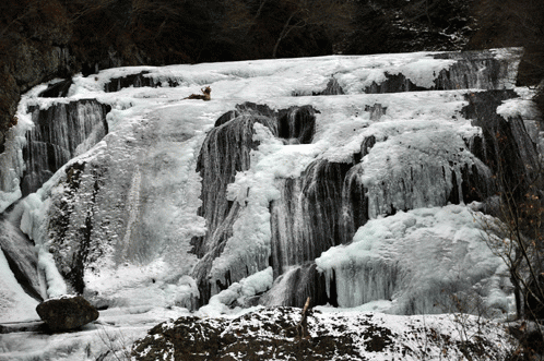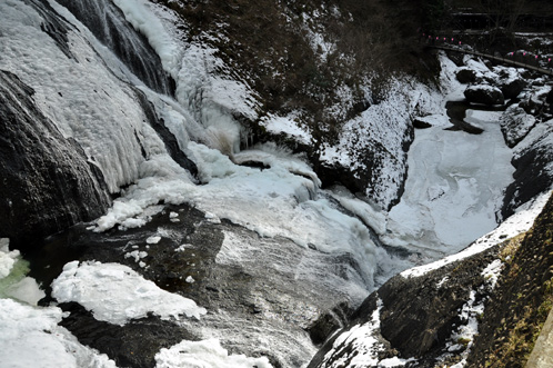 この日はお昼過ぎに到着したため、滝の一部は融けてチョロチョロと流れていたのですが、近くのお店の方に伺ってみると、朝のうちは完全凍結することもあるとのことです。