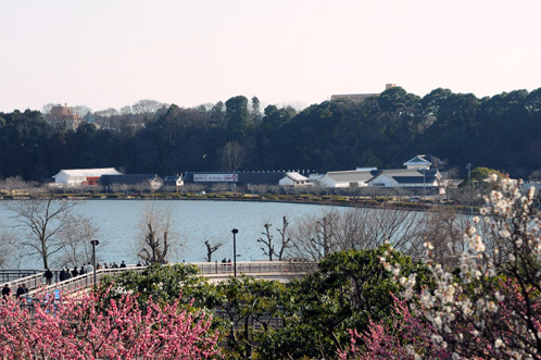偕楽園広場から千波湖を見下ろすと…梅の花越しに見えるは映画桜田門外ノ変の撮影で使われたオープンロケセットです。