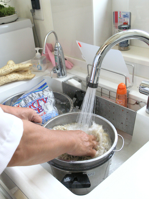 熟練の目で茹で時間を見極め、氷水でキリッと締めます。