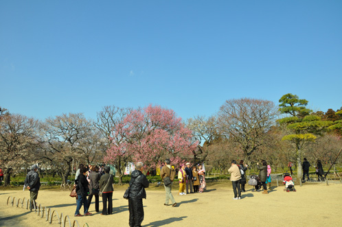 黄門様や梅大使の方々が記念撮影に応じてくれる見晴らし広場のピンクの梅の木の下は、特に混雑しています。