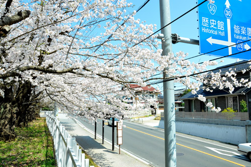 桜山から歴史館へ続く坂を登ると、このように桜が歩道までせり出して咲いています。