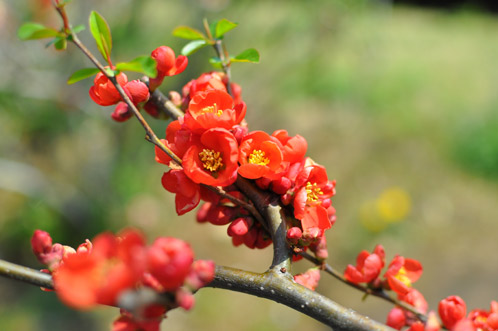 偕楽園の東門から千波湖へと降りていく歩道橋付近では、木瓜(ぼけ)の花が鮮やかに咲いています。