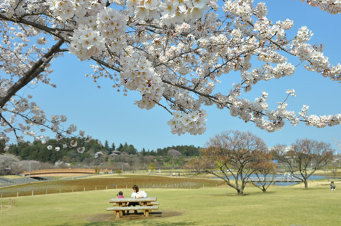 芝生の緑と青い空に白やピンクの桜の花が大変映えます。