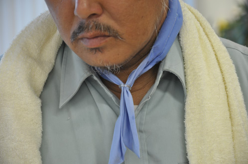スカーフに十分に水を含ませ、蒸発していく際の帰化熱の作用によって体温を下げるんです。