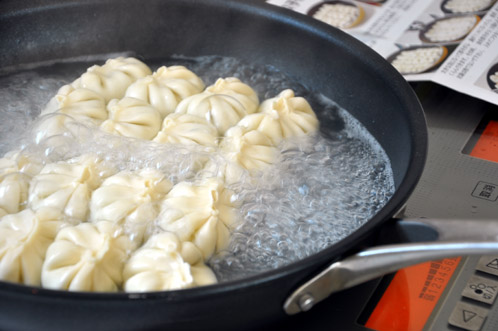 最初は、餃子が2/3程隠れるぐらいにお湯を入れ、フタをして7分ほど蒸します。