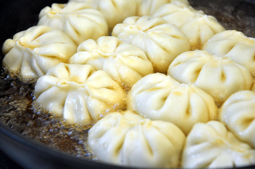 お湯が1/4ぐらいにまで減ったら、油を餃子が2/3隠れるまで入れて再びフタをして5分間強火で焼きます(…というより揚げるんですね)