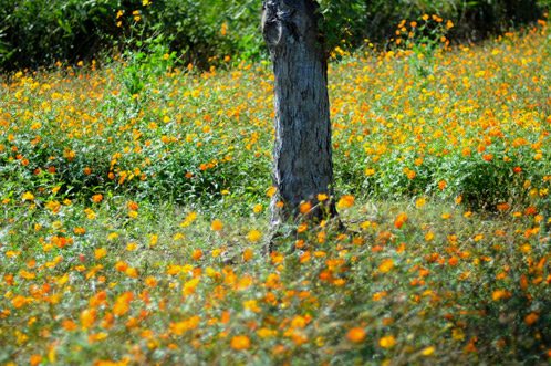 この日の天気は、絵にかいたような秋晴れで、木々の間から洩れる強い陽光のスポットライトがキバナコスモスを輝かせていました。