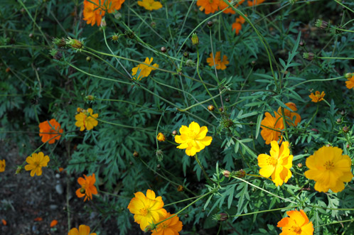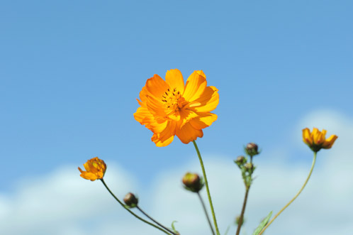 白やピンクのコスモスとは同族異種のキバナコスモス(黄花秋桜)は、こってりとした黄色やオレンジの花を咲かせます。