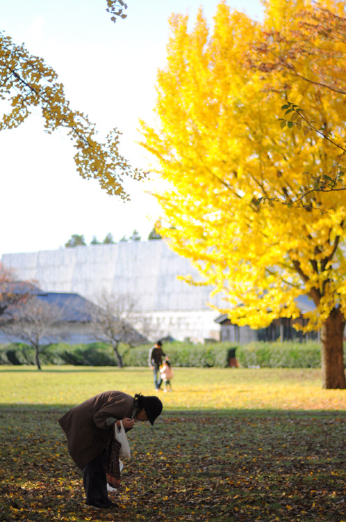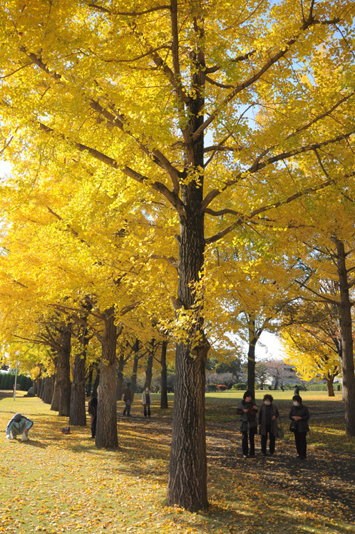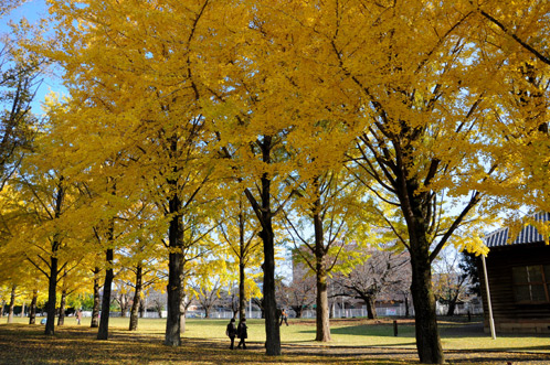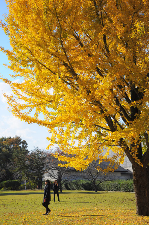 冬を前にして、かろうじて残っている芝生の緑ですが、銀杏の樹の下の部分だけは落ち葉で黄色くなっていて面白いですね。