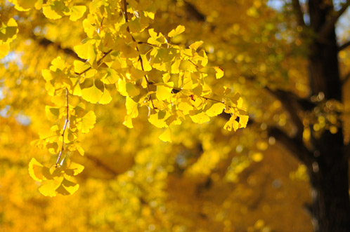 黄葉したイチョウの葉を通って降り注ぐ光、或いは木漏れ陽を浴びると、なんともいえないホッコリとした気分になりますよ。(ただし足元のギンナンにはお気をつけて)