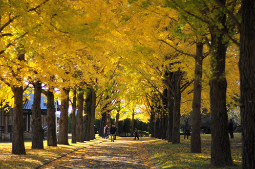 まだ葉があまり落ちていないこの時期の銀杏の並木道の下を是非通って頂きたいのです。