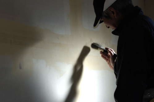 壁紙を剥がれ、武骨な表情になった壁の継ぎ目に「下塗り」という下地処理をしていきます。