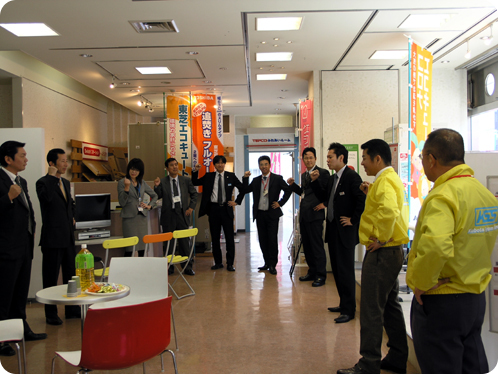 当社やご参加いただいた各メーカー様全員で、気合いの円陣ミーティング。